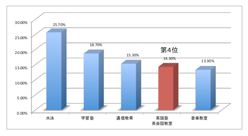 上のグラフは、男女小学1〜6年生のお子さんを持つ親御さんに現在どのような習い事に通わせているかをアンケート調査した結果です。